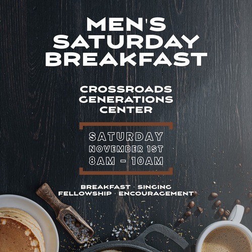 November's Men's Saturday Morning Breakfast will be at Crossroads! All men are encouraged to attend as we break bread together, fellowship, sing together and hear words of challenge and encouragement.